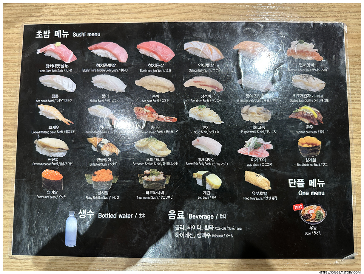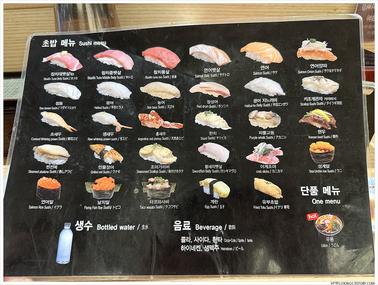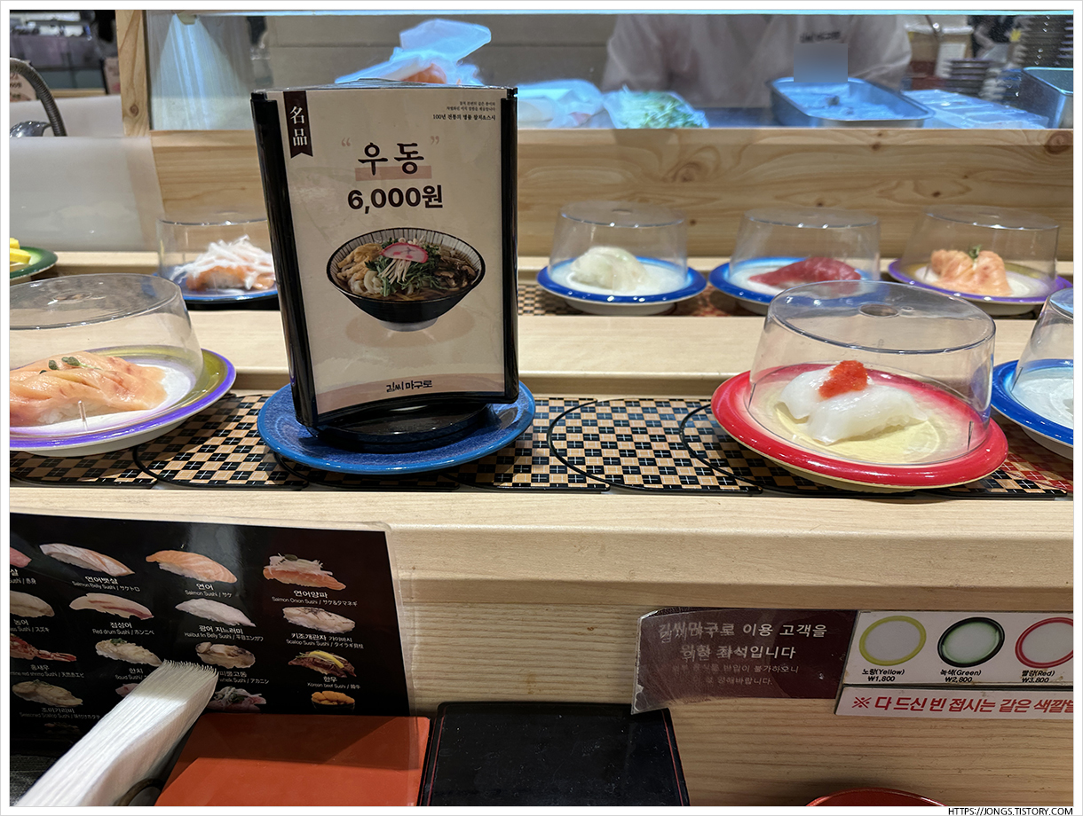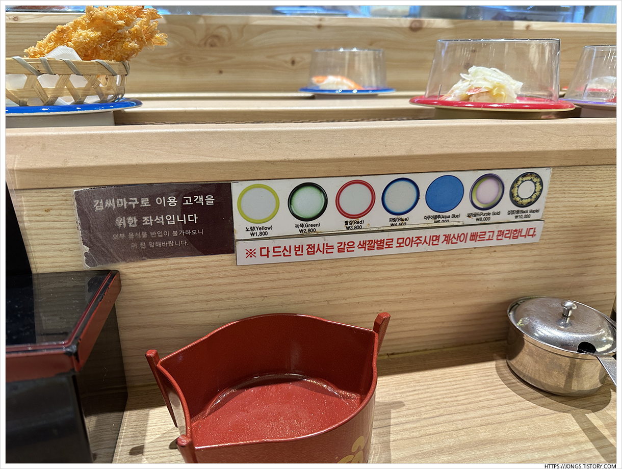 ▼ 초록 접시가 그나마 계란초밥이고 노랑과 퍼플은 먹는 동안에는 보지 못한 것 같습니다. 거의 빨강접시부터 시간한다고 생각하시면 될 것 같아요.
