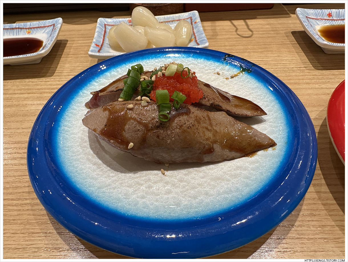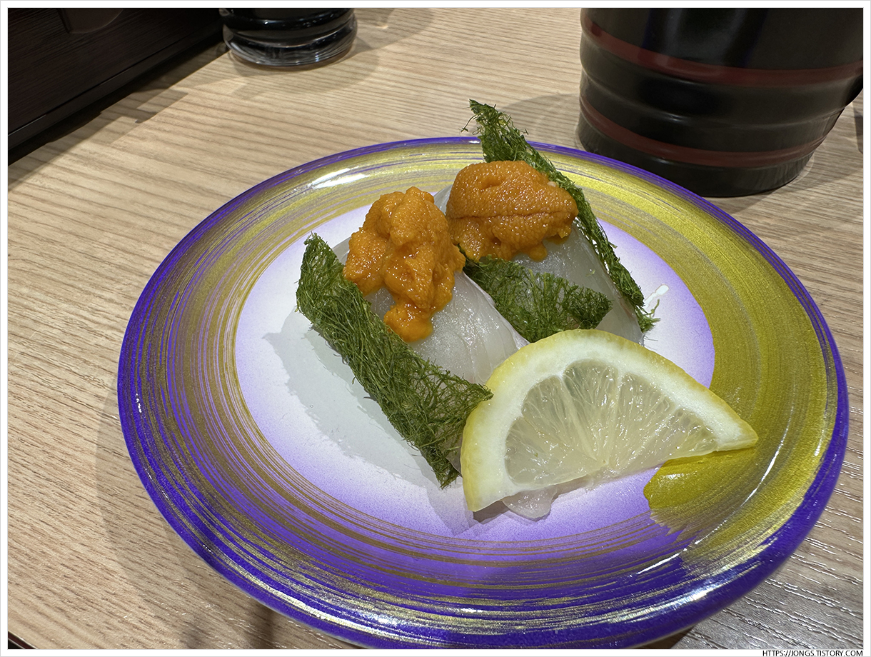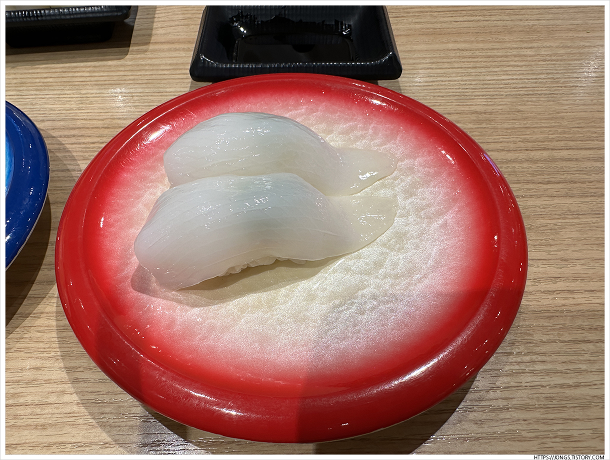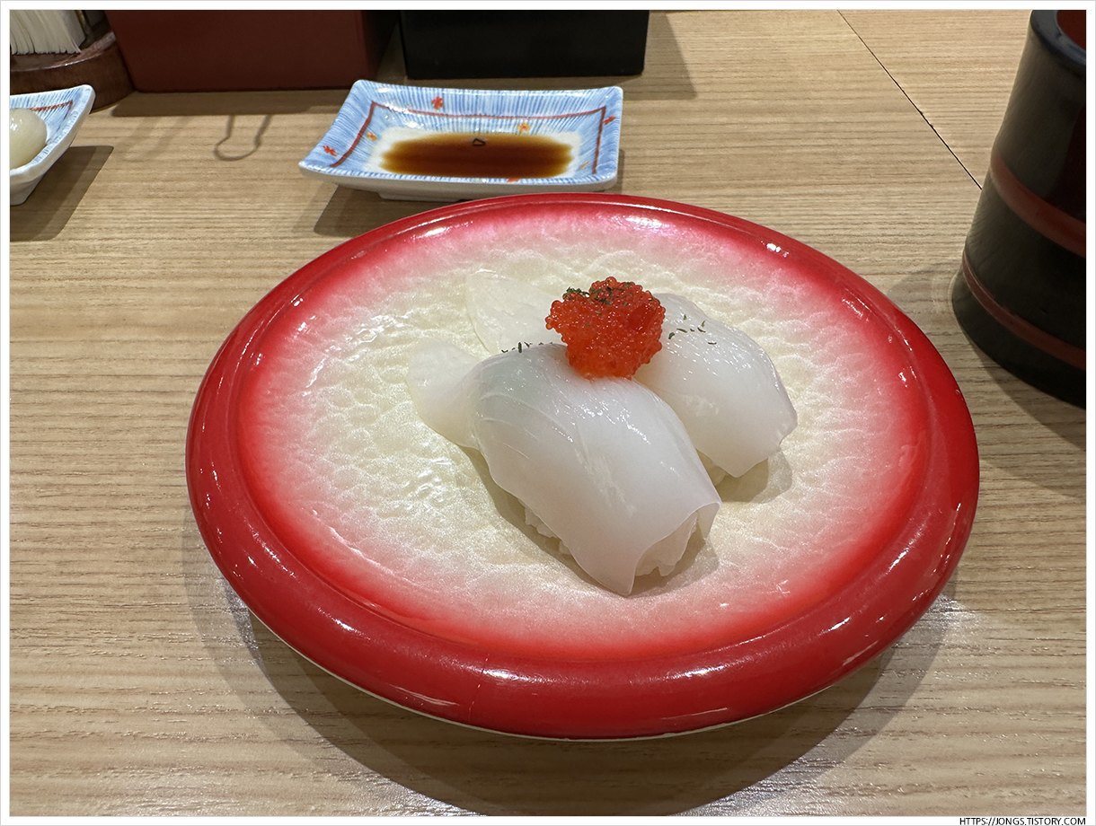 ▼ 갑오징어+날치알 초밥입니다. 회전대에 올려진지 얼마 되지 않은 것을 가지고 왔고 녹진함이 정말 좋습니다.