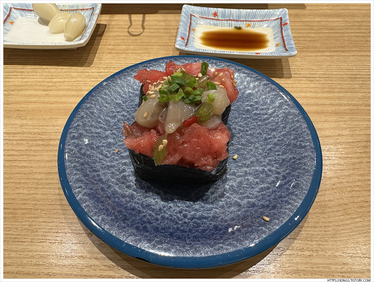 ▼ 낙지탕탕이+참치다진김말이초밥 하나더 먹었습니다. 입안 가득한 참치의 풍미와 낙지의 식감이 정말 잘 어울리네요.