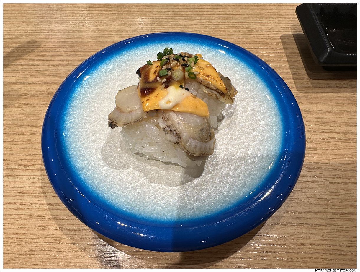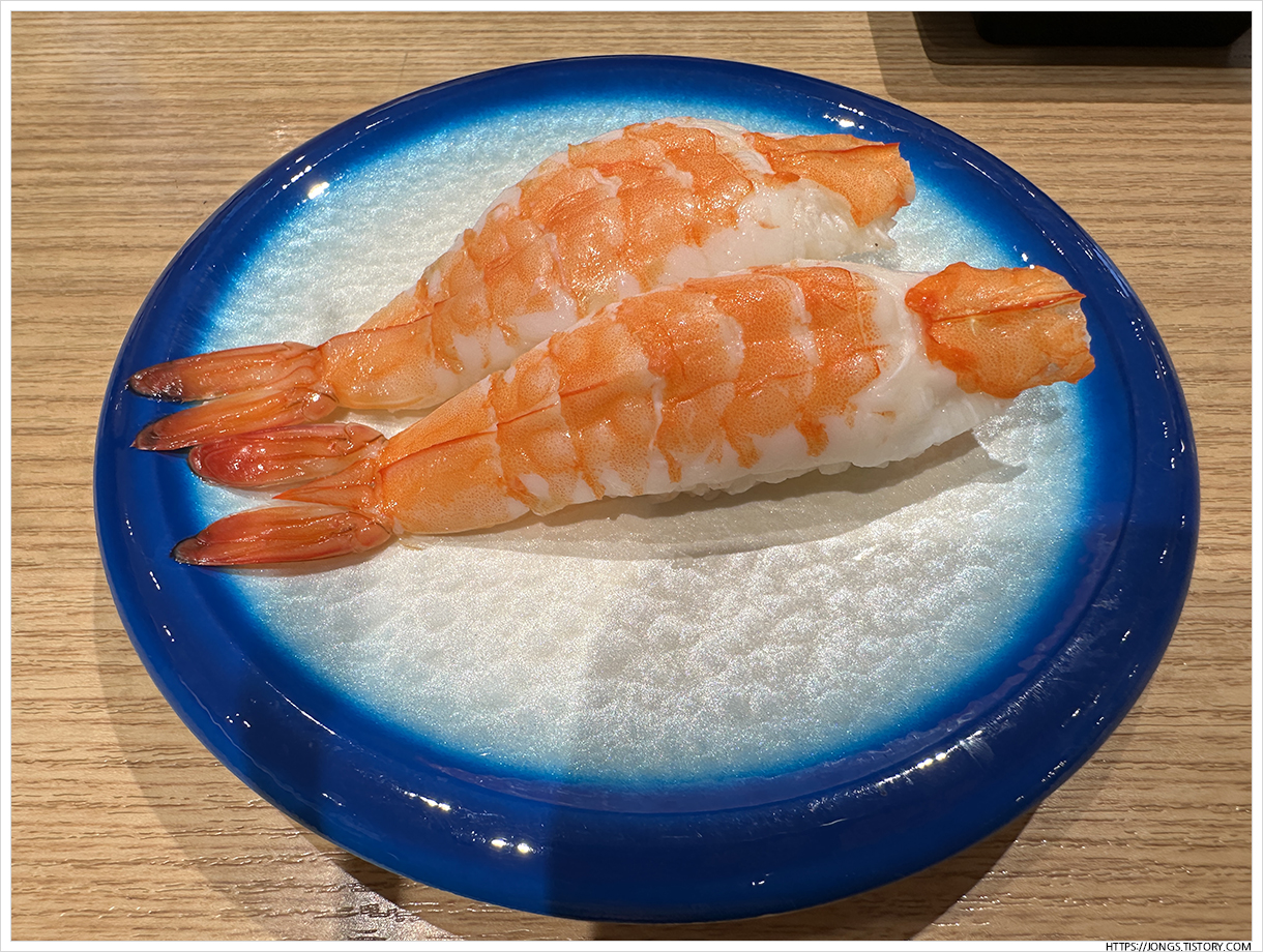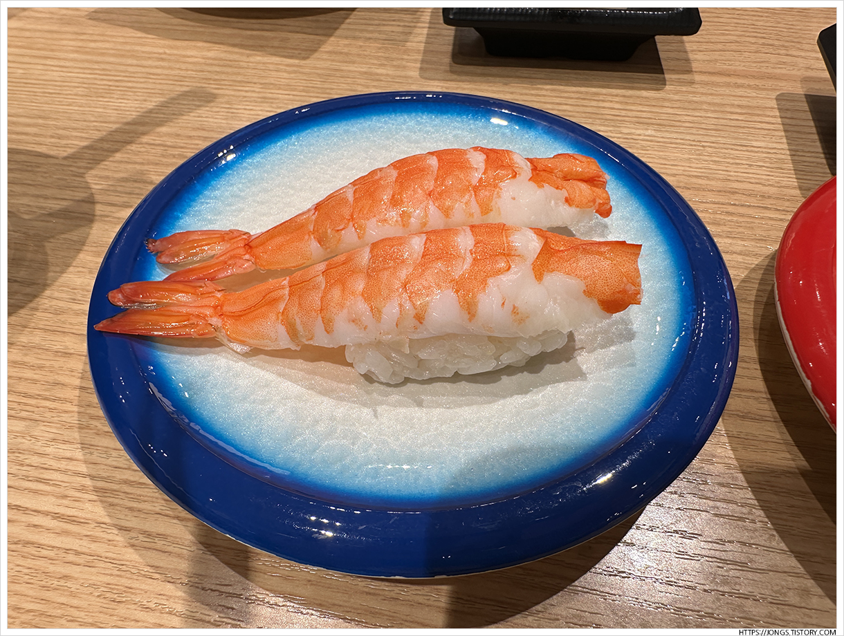 ▼ 초새우초밥도 만든지 얼마 되지 않은 초밥이 회전대 위에 있어서 가지고 왔습니다. 갑각류 맛은 기본은 하니 손길이 가는 것 같습니다. 가을 새우철이라 그런지 살이 두툼한 느낌입니다.