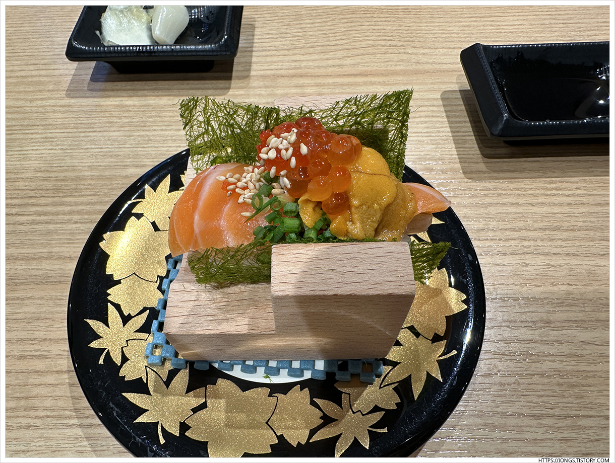 ▼ 이 메뉴도 정말 맛 있습니다. 감태에 연어, 성게알, 연어알, 날치알?! 등이 올라가 있는데 입속에 넣으면 들어가 있는 재료들의 맛이 풍부한 맛을 내고 예전에는 보지 못했던 메뉴입니다.