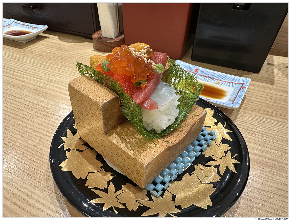 ▼ 맛있는 재료의 조합입니다. 감태에 참치등살, 성게알,연어알, 날치알이 들어가 모든 맛이 총 망라된 초밥입니다. 크기도 커서 한입에 넣기가 조금 어려웠지만 입안에서 느껴지는 다양한 맛들이 정말 좋네요.