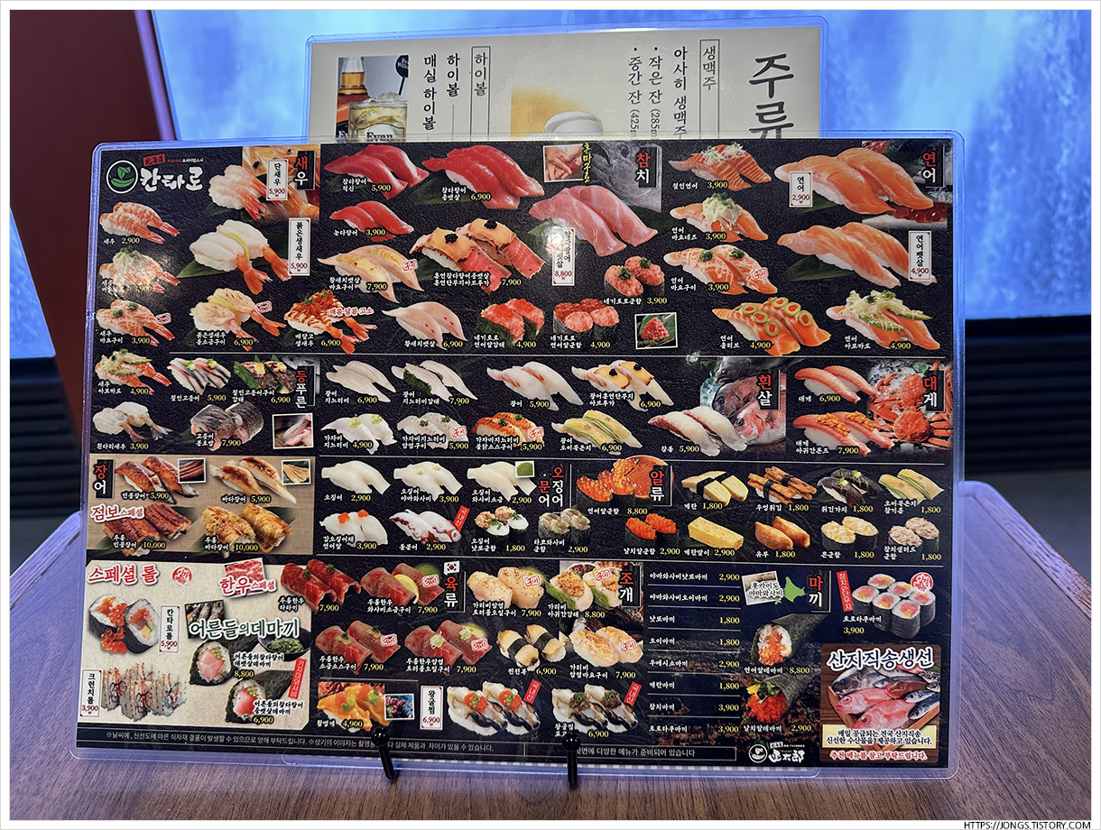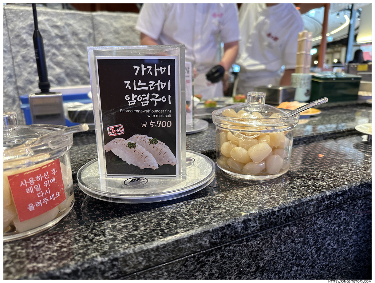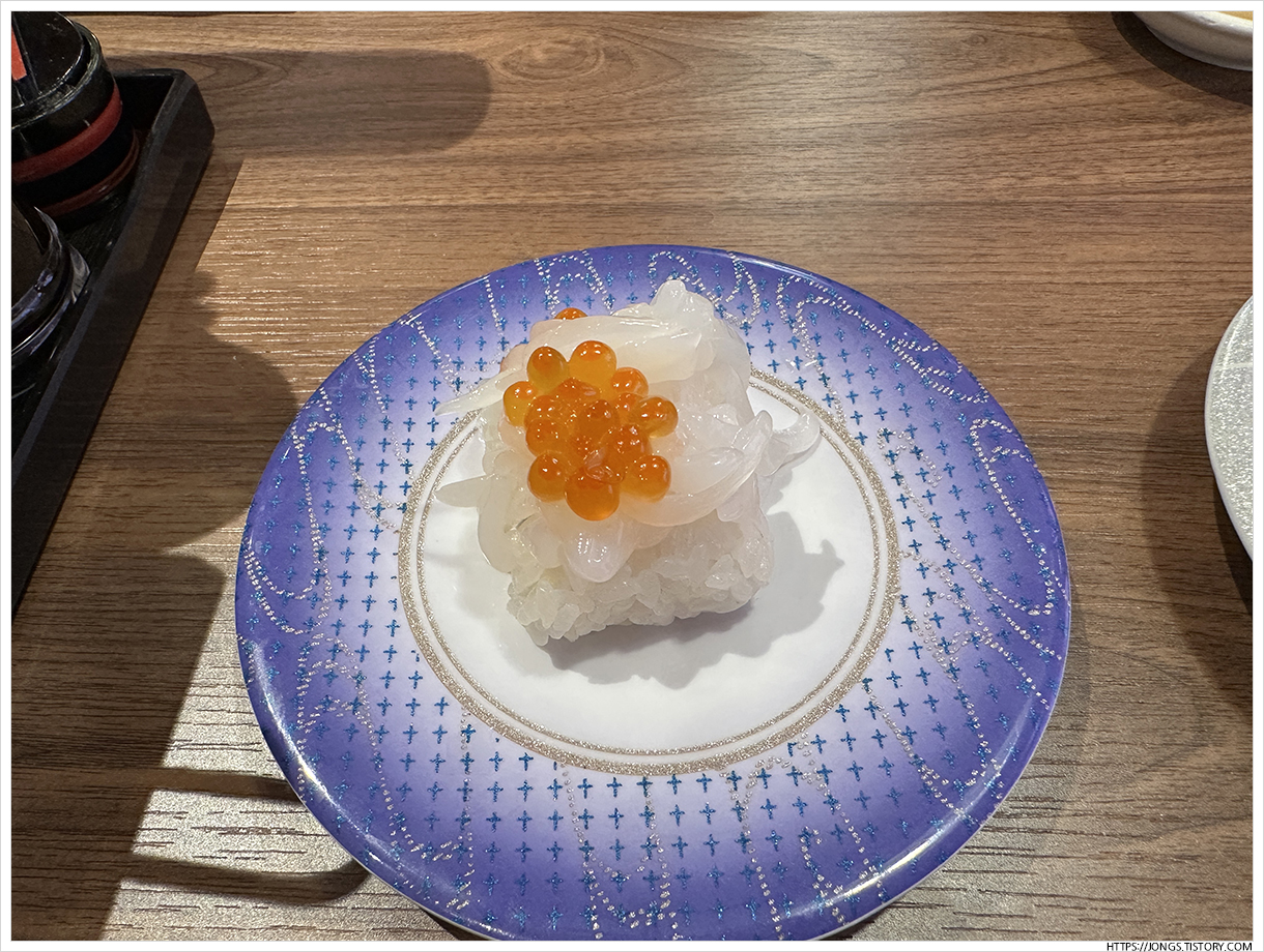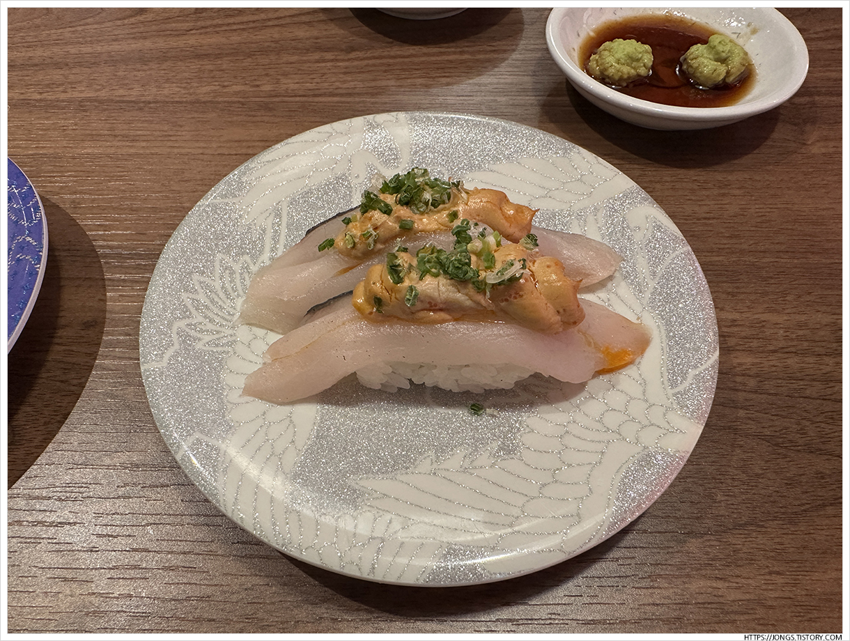 초밥을 좋아하다 보니 다음 방문 때 꼭 와야지 하고 11월달에 2번 중순과 말에 방문을 했는데 대만족입니다. 일단 초밥의 사이즈가 크네요. 밥 위에 올라가는 네타라고 부르는 재료가 두껍고 큽니다. 몇 개 안 먹었는데 배가 불러 오더군요. 맛이 확실합니다. 소스가 들어간 것, 기름진 맛이 강한 스타일였습니다. 회전초밥 전문점 중에 일본 초밥의 맛을 가장 잘 재현한 곳이 갓덴스시와 칸타로라는 이야기도 포스팅 되어 있네요. 스타필드 고양에 갓덴스시가 있어 가볼려고 했으나 사람들이 많이 대기해서 방문을 못 했었는데 칸타로로 바로 시작해 봅니다.