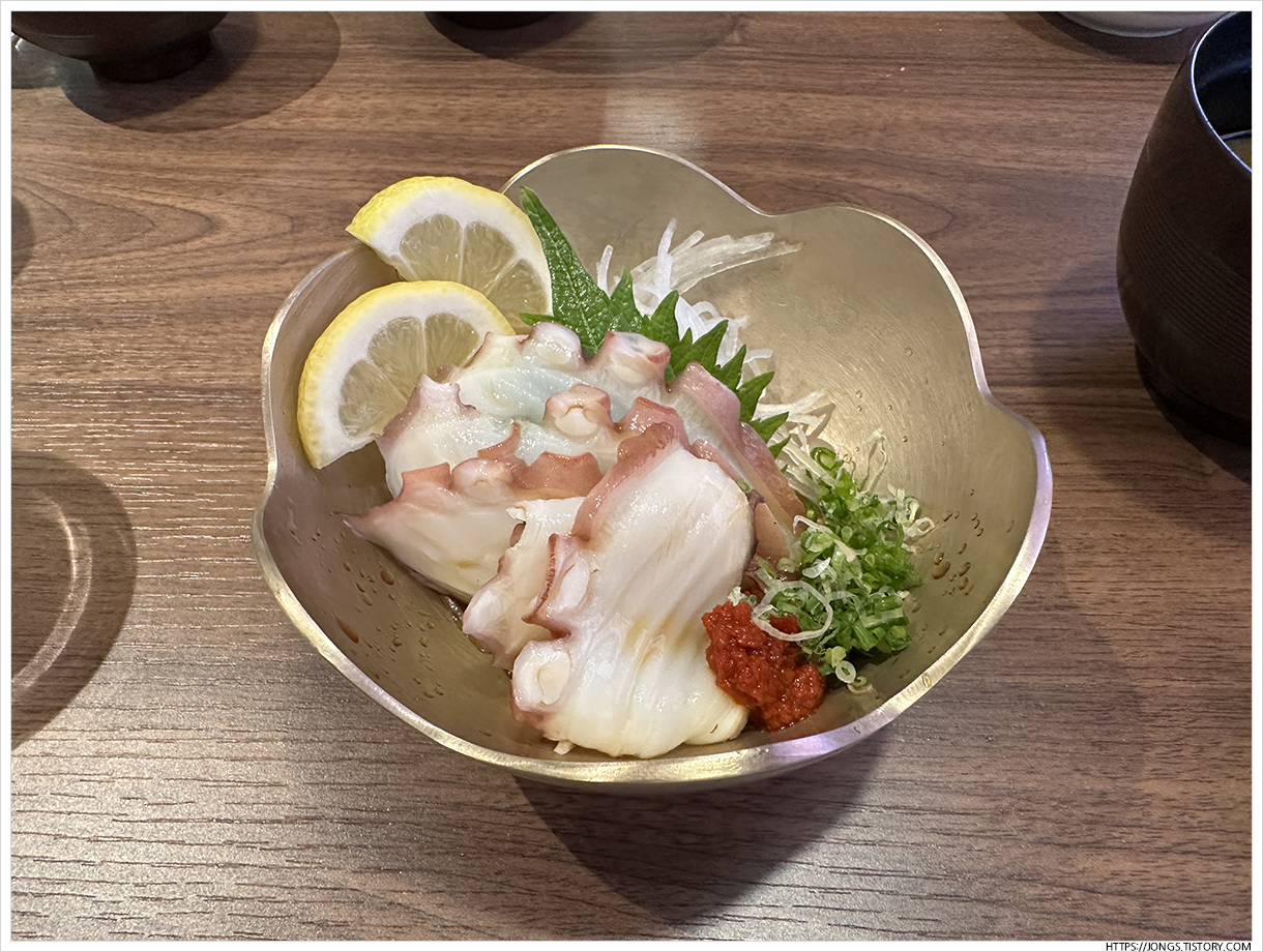 ▼ 처음에 메뉴 이름을 촬영해 놓지 않아서 이름을 모르겠네요. 아귀간 폰즈 소스가 올라 갔는데 고소한 아귀간 폰즈 소스가 감칠맛을 폭발적으로 만들어 줍니다.