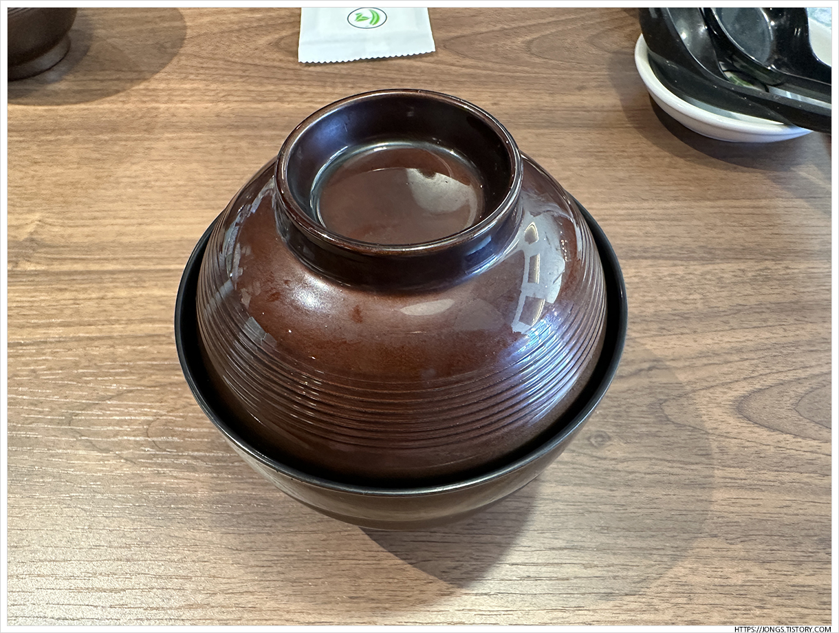 ▼ 기본 장국입니다. 장국 뚜껑이 장국이 담겨진 그릇을 들어 올리면서 떨어지는 경우가 있어 아래 국그릇을 잡고 뚜껑을 열어 달라고 직원분이 이야기 해 주시네요.