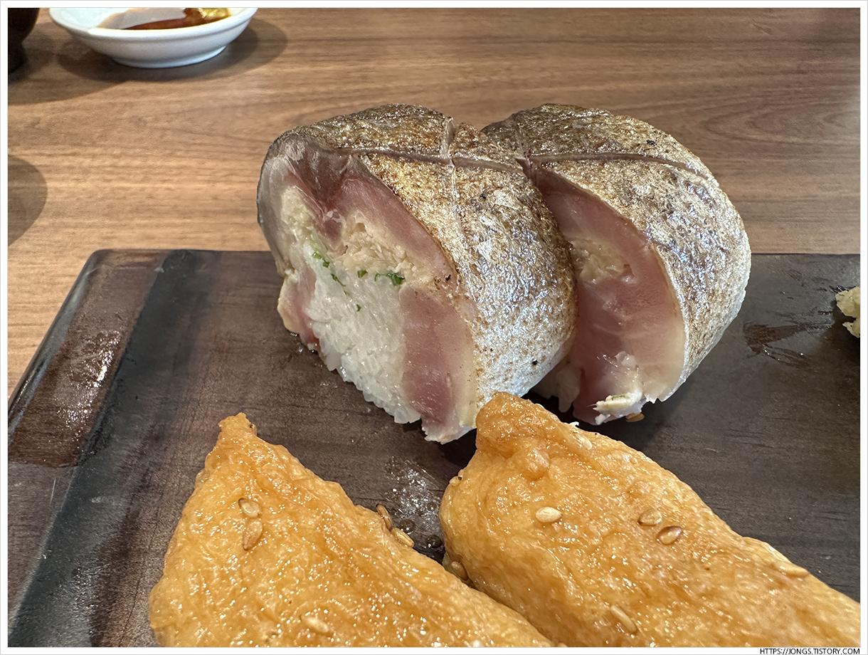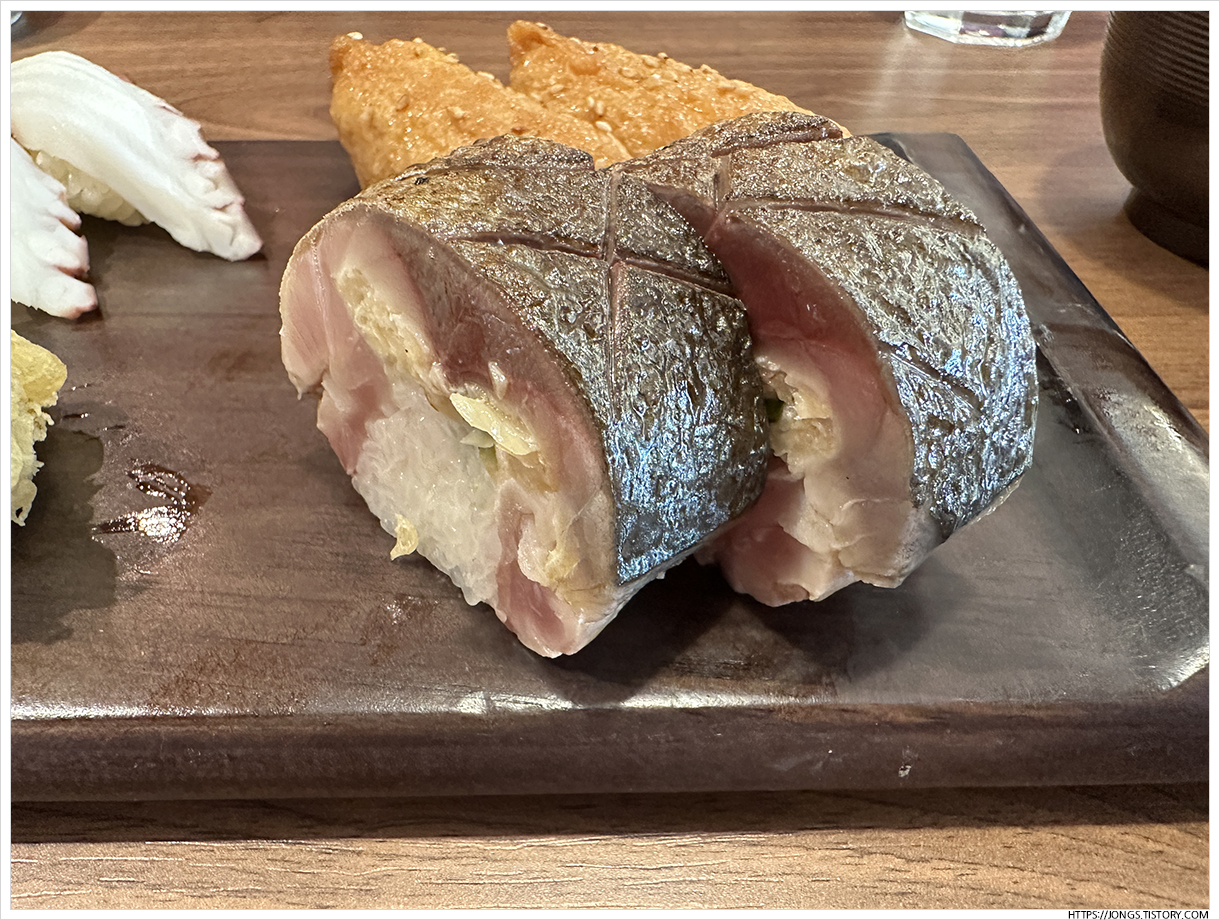▼ 고등어 봉초밥(7,900원)입니다. 겉은 불로 살짝 아부리(겉을 불로 살짝 익히는 것) 했습니다. 크기가 상당히 큰데요 1개가 입안 가득 찰 정도의 크기입니다. 고등어도 비리지 않고 고등어 특유의 맛이 정말 좋네요. 2개 먹으니 배가 불러 오기 시작합니다.