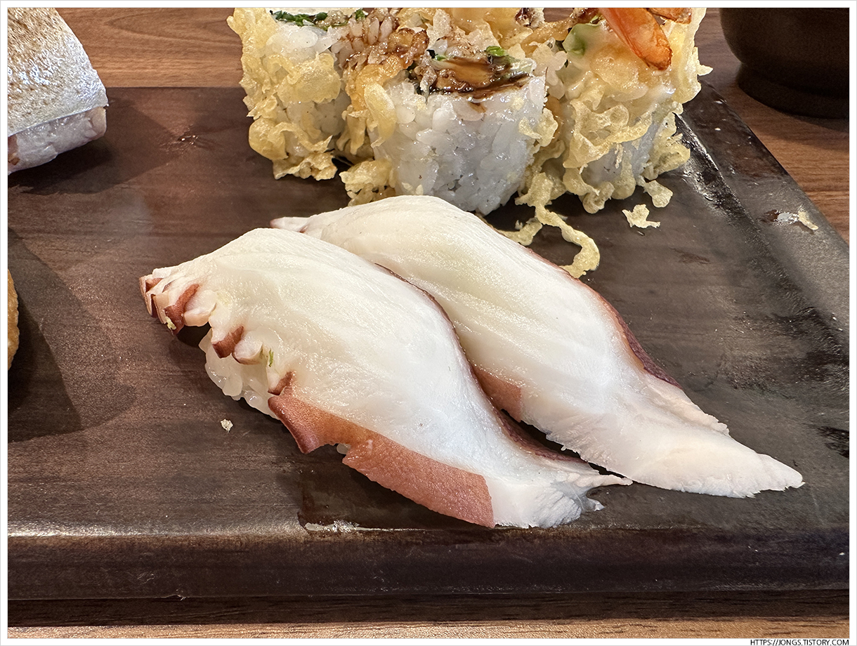 ▼ 메뉴에 있는 것을 주문 했습니다. 좌측 위쪽부터 고등어 봉초밥(7,000원), 크런치롤(3,900원), 돌문어(2,900원), 유부(1,800원)입니다.
