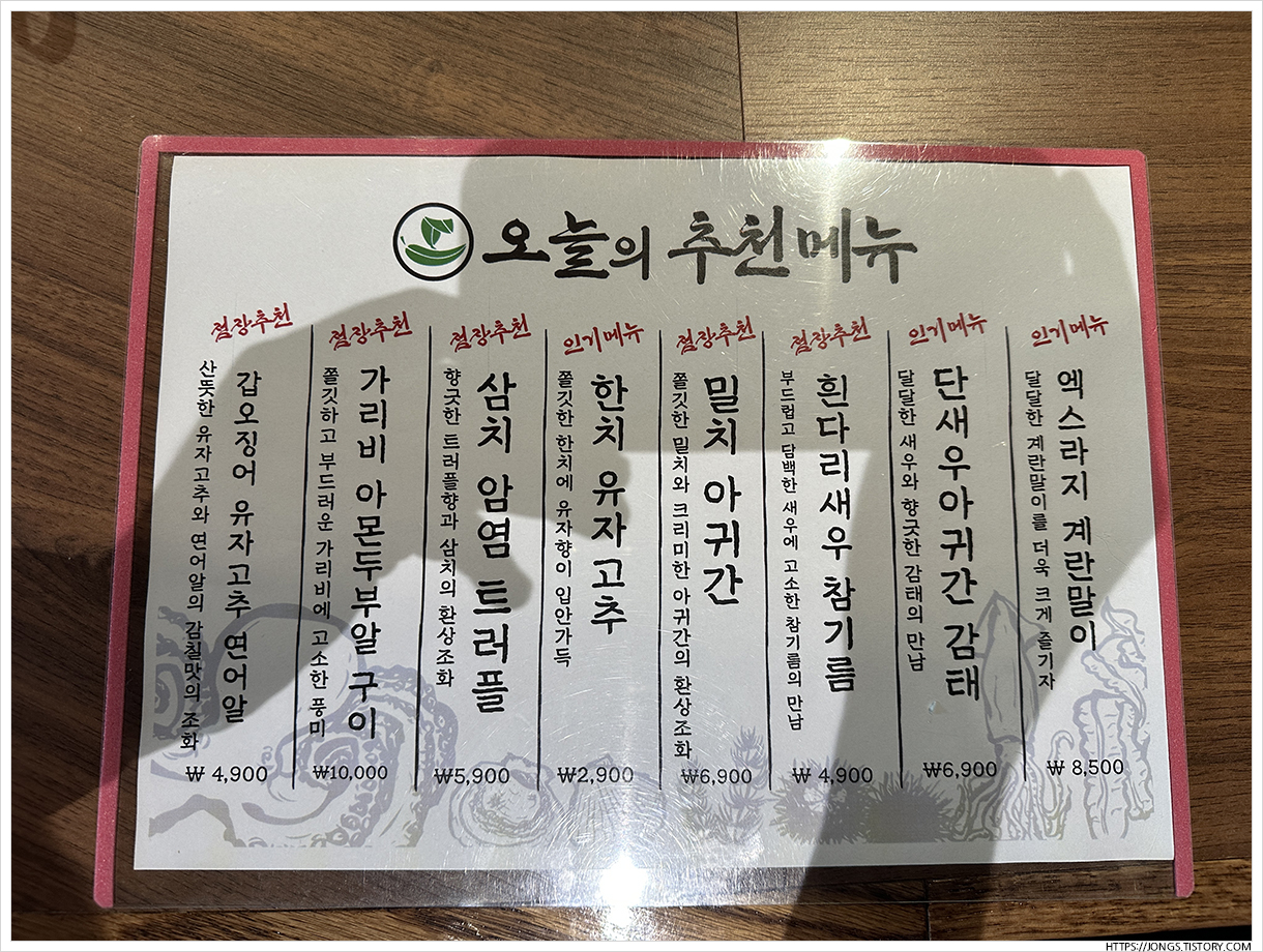 ▼ 오늘의 추천 메뉴는 아래와 같습니다. 오늘의 추천메뉴에서는 가리비 아몬두부알 구이(10,000원)를 주문했습니다.