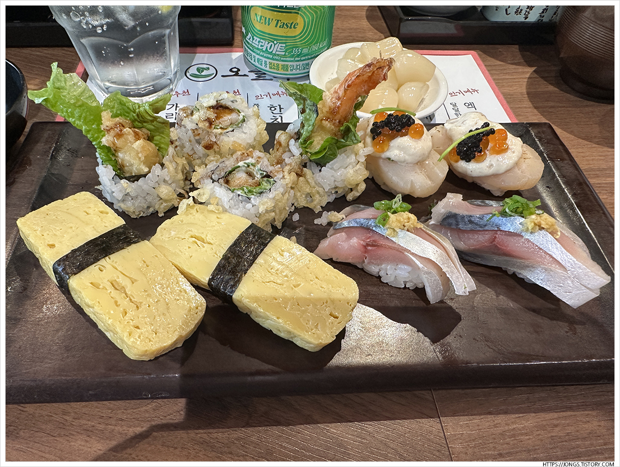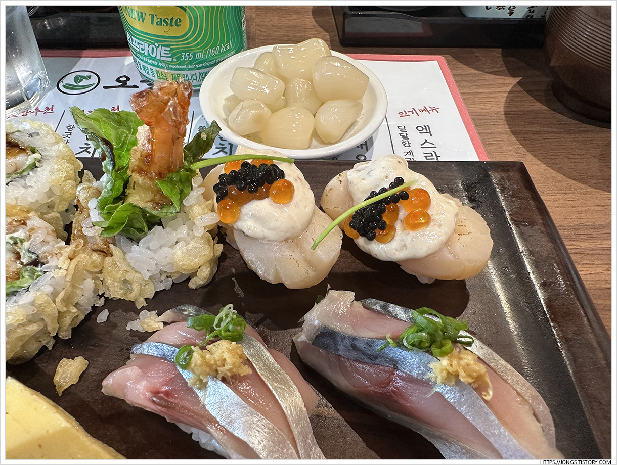 ▼ 스프라이트 355mL 1개 주문했고 메뉴판에 있는 메뉴를 주문했습니다. 앞서 이야기한 점장 추천 가리비 아몬두부알 구이(10,000원)와 함께 닭튀김(5,500원), 절인고등어 초밥(5,900원), 크런치 롤(3,900원), 계란 초밥(1,800원)입니다.